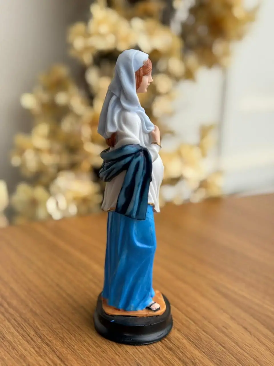 Indicada para oratórios, momentos de oração, ambientes familiares ou como presente religioso, especialmente para gestantes e futuros pais.